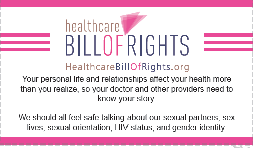 Healthlink, a network of LGBT community centers and other partners, has recently posted a Healthcare Bill of Rights to affirm exactly what we can expect from the system, and establishes a foundation for challenging the system when it fails. These fundamental rights are:
